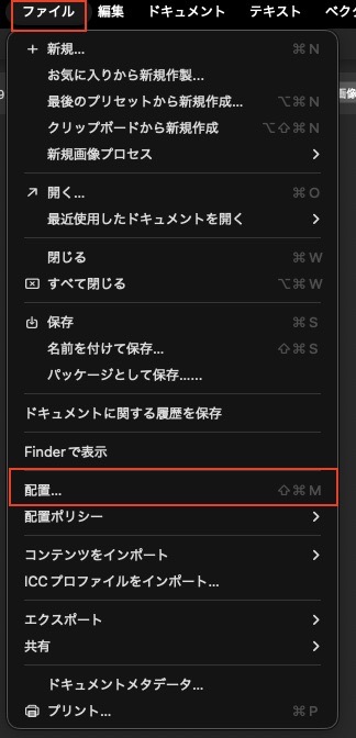 「ファイル」→「配置」→背景に使う画像を選択します。